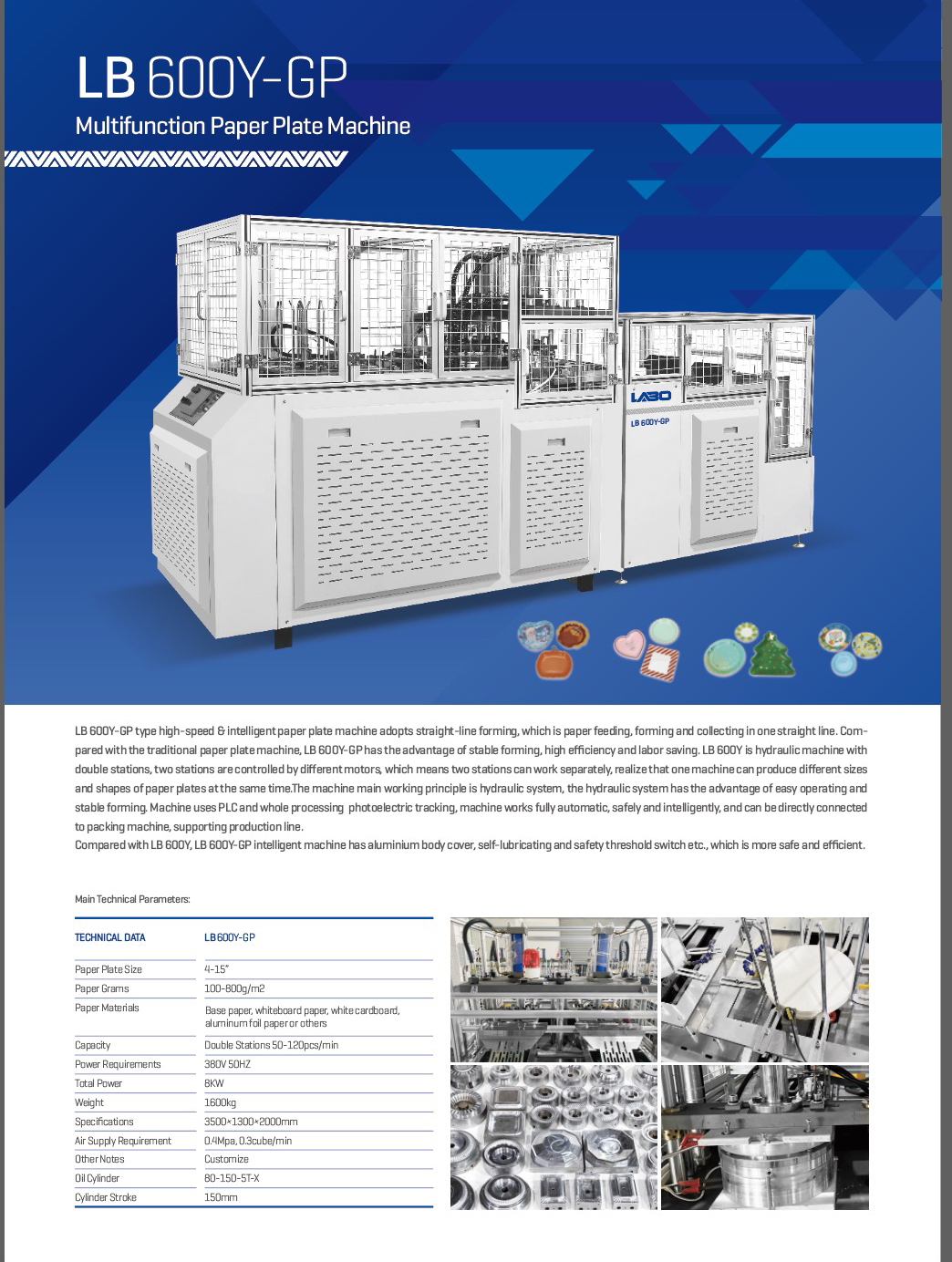 LB 600Y-GP采用桌面式布局,将成型模具与传动部分隔离。把传动件设置在台面下机架箱体内,自动润滑。采用机械式传动,液压式成型,气动吹盘,成型稳定,便于操作。电器采用PLC控制,全程光电跟踪监测,所有电器均为施耐德品牌,机器带有防护罩,全自动安全智能生产,可直接配套流水线生产。